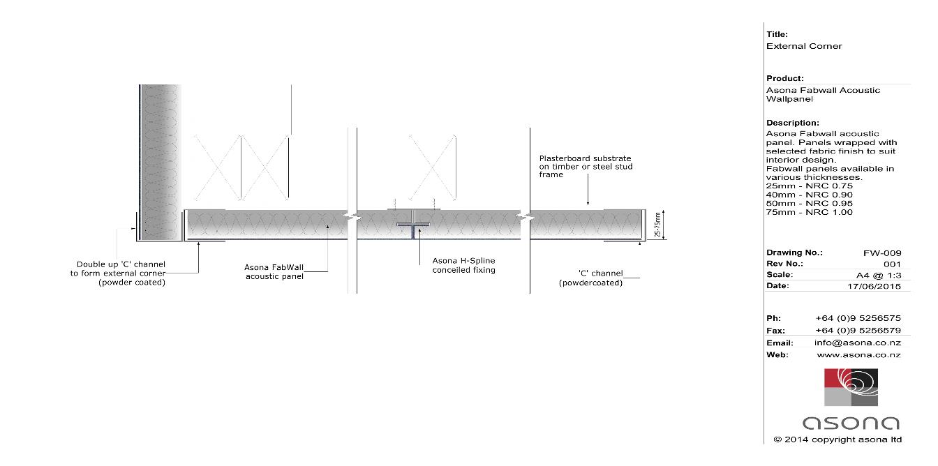Manufactured in New Zealand from bio-soluble resin glass fibre absorber with impact resistant Sonatex™ 250 kg/m³ composite facer panel, resin edge reinforcement and wrapped with a decorative fabric finish.
